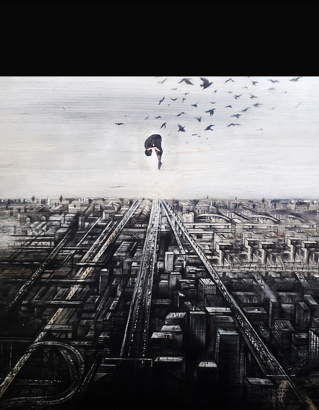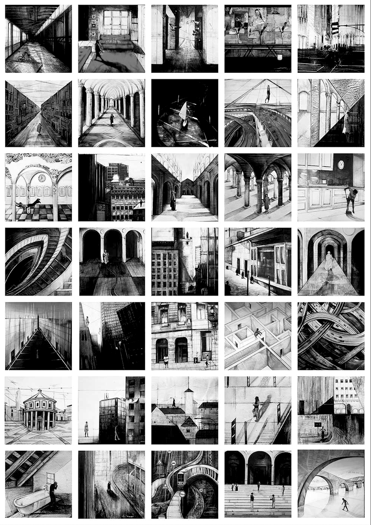 Un linguaggio pittorico dove la grande padronanza dei mezzi tecnici non scade mai in un semplice sfoggio di virtuosismi prospettici e compositivi, ma diventa puro viatico per dar origine a un universo fatto di gabbie prospettiche serrate e asettiche che accolgono rare presenze umane. Le architetture dell’artista pugliese rinunciano a ogni capriccio estetico, in favore di una raffinatissima operazione di sottrazione che esalta una volumetria semplice, ma al tempo stesso incombente, la cui grandiosità è spesso accentuata dall’uso di tinte scure e terrose.